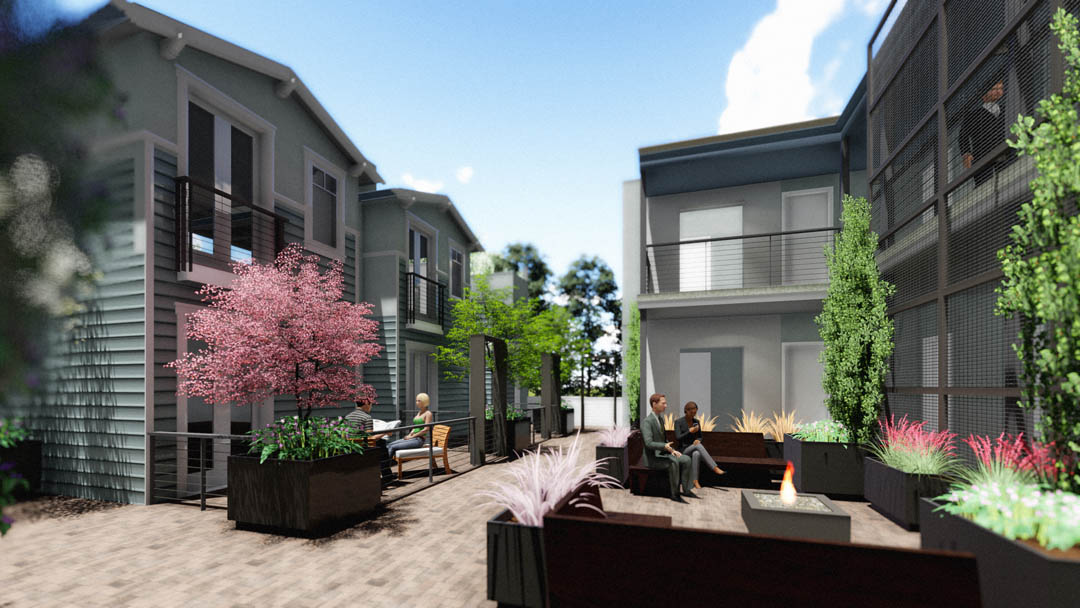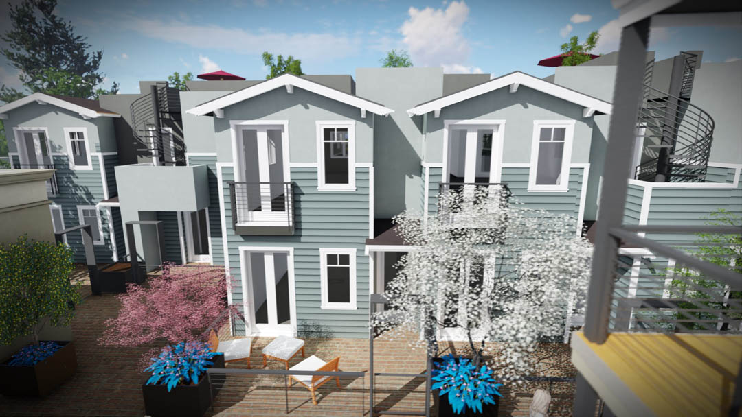 Pacific Courtyards is a mixed-use project located in Downtown San Luis Obispo. The project contains nine residential units, office space and a parking garage in two separate three story buildings. Building “A” contains three multi-story condominiums. Building “B” is a mixed-use building containing residential, office, and a parking garage. The residential units and offices in Building B share a central courtyard located on the podium level.