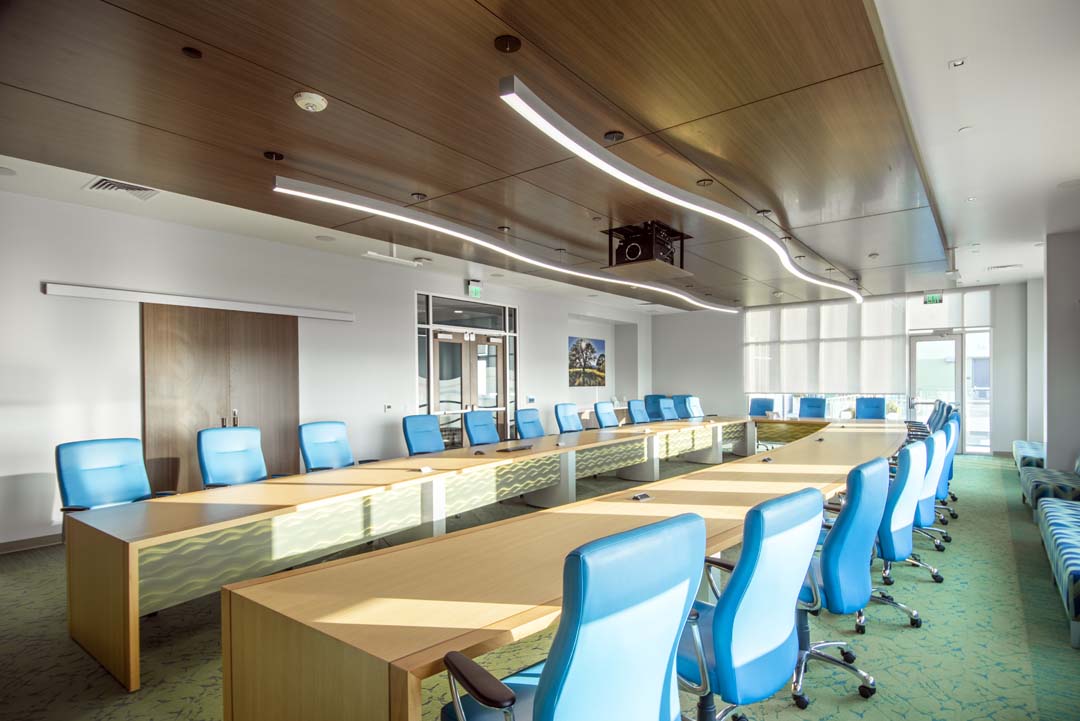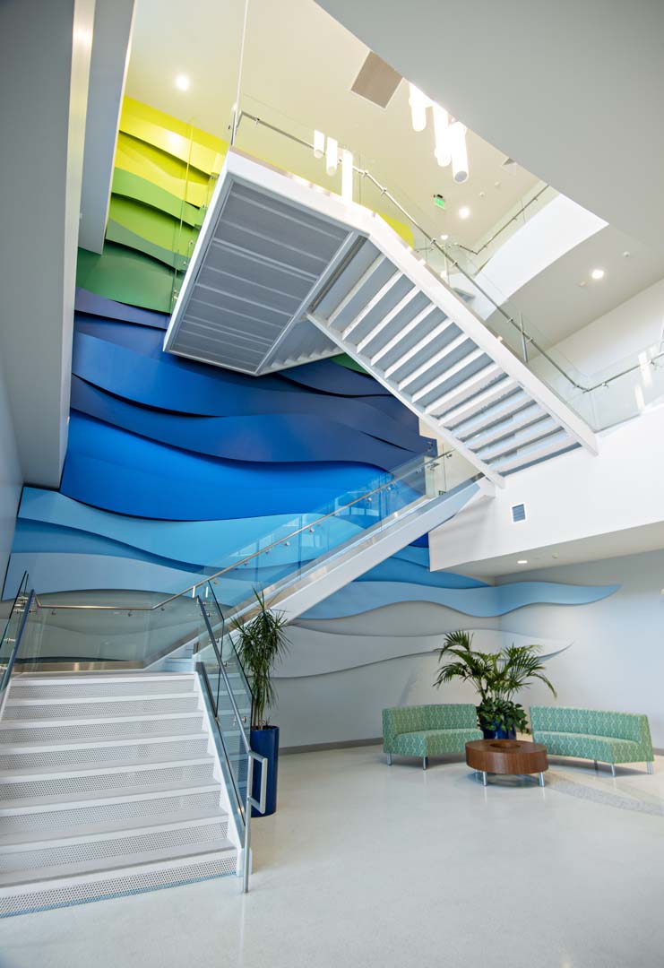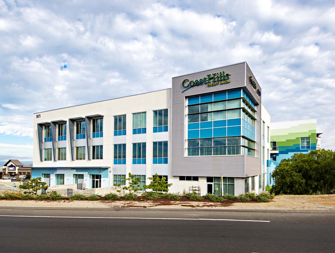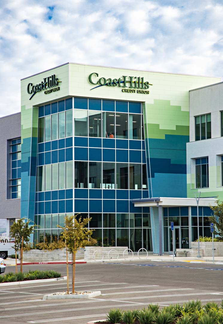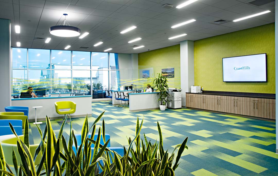 CoastHills is the main branch and corporate headquarters for CoastHills Credit Union. The 90,000 SF office building is located within the Enos Ranch development and will be a prominent landmark along hwy 101 and Betteravia Rd. The building features a rainscreen façade that flows along the buildings elevation and entry tower in the greens and blues of the CoastHills logo. The entry lobby is open to all three floors and highlights a three-story art wall adjacent to the suspended entry stair.