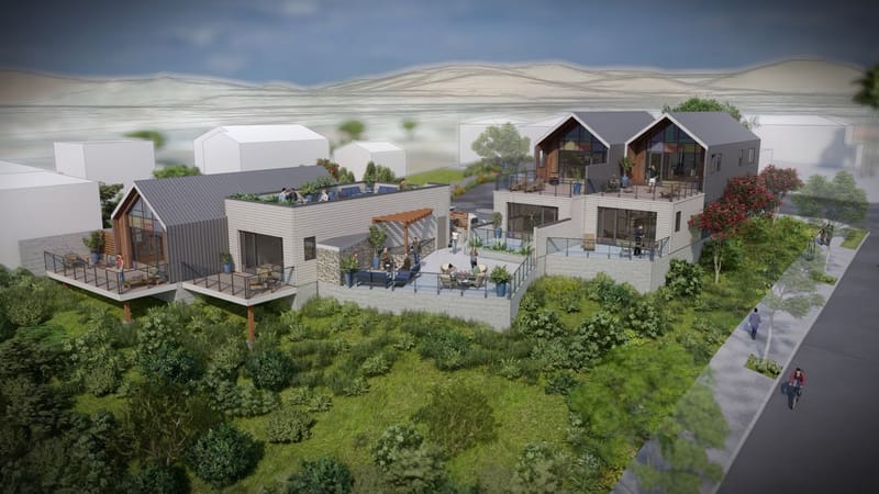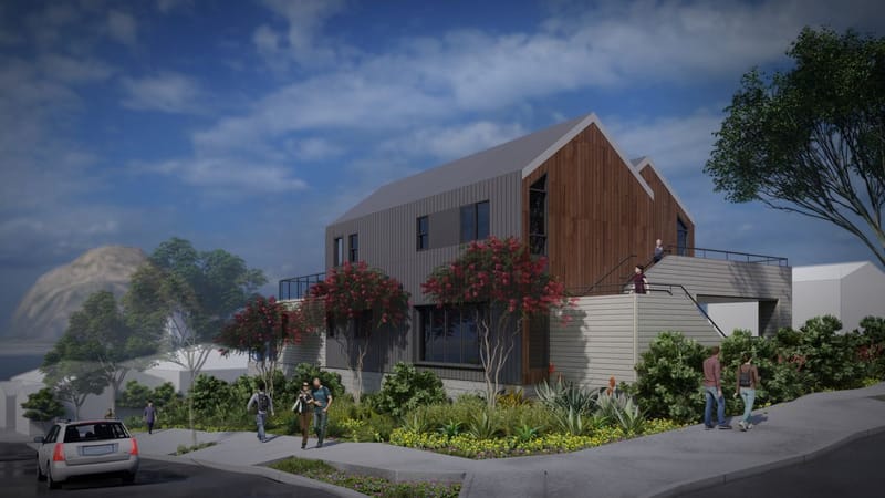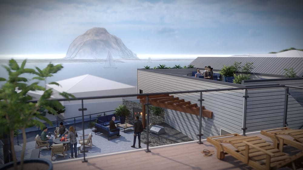 This boutique beachhouse hotel features six refined guest rooms, each with a private patio, stained glass inspired windows, expressive gable rooflines, and modern details for an elevated coastal stay. Shaped by bluff setback constraints, the building steps with the site to create shared decks and expansive patios, all oriented toward sweeping ocean views and iconic Morro Rock.