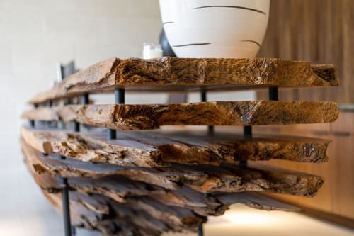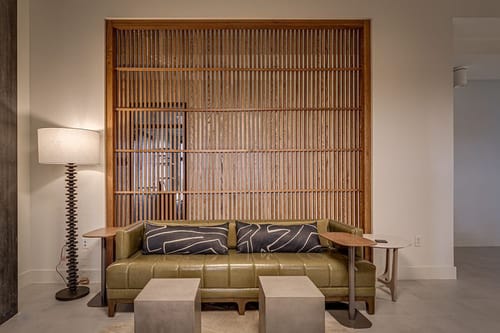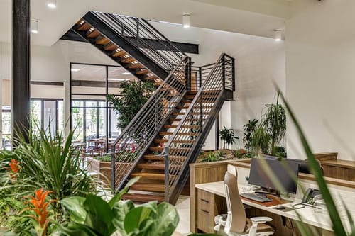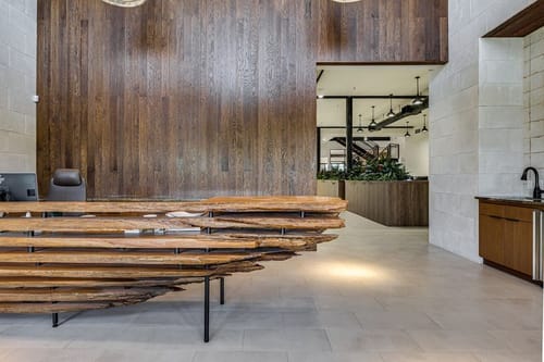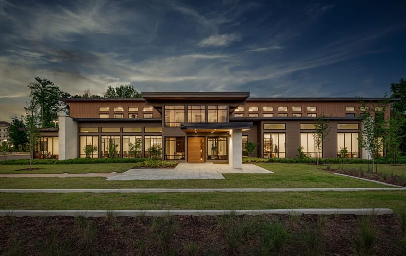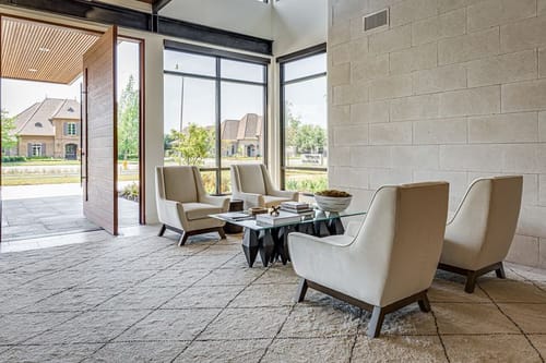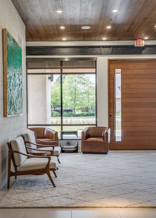 Along the front elevation, the building's long and low-silhoutte blends in with the surrounding lush landscaping, and large expanses of windows and storefronts flood natural light throughout the interiors. The oversized pivot door and cantilevered front canopy element through the tall, double-height lobby provide an impressive and dramatic first impression.